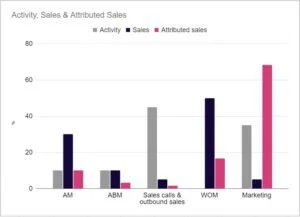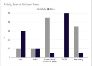 So we can see outbound sales have the highest percentage of activity, but the lowest direct sales. This can be more easily understood by thinking about the role of a salesperson. The majority of their time is spent on direct activity to drive sales, and from that, some sales will be directly generated. In comparison, word of mouth has no outbound activity but sales are often directly attributed to that source.